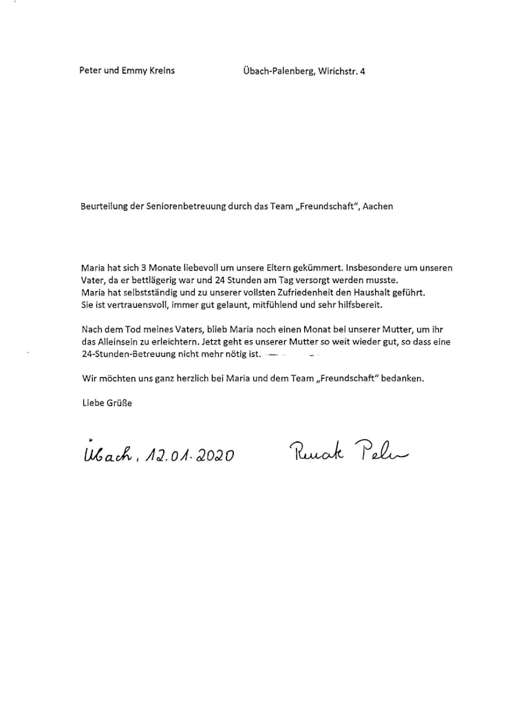 Wir funktionieren deshalb so gut, da wir für Menschlichkeit, Einfühlvermögen und Zuverlässigkeit stehen. Das gilt auch für unsere erfahrenen Pflegekräfte aus Osteuropa.